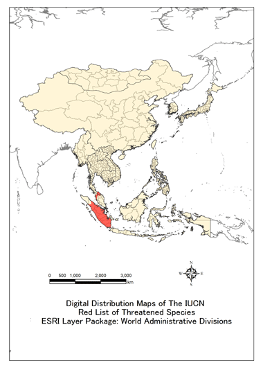 This species is found in Sumatra (Indonesia) (southeast of Lake Toba and the Singkil River), Peninsular Malaysia (from the Mudah and Thepha Rivers in the north to the Perak and Kelanton Rivers in the south) and south Thailand (near the Malaysian border, east of the Thepha River watershed (Gittins 1978; Groves 2001; Marshall and Sugardjito 1986; W. Brockelman pers. comm.).